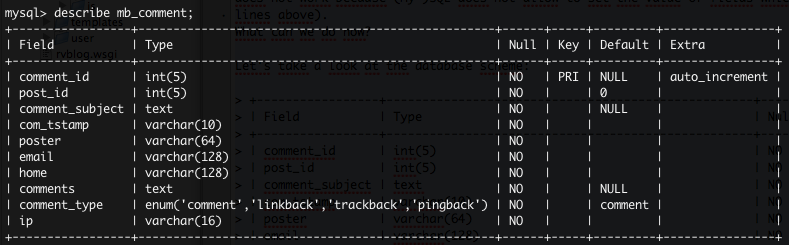 Now we come to the tricky part.. The home-field is the next to last field so the only field we can inject some data in is the comment_type field which is not printed out. What a pity! Using some injection string like