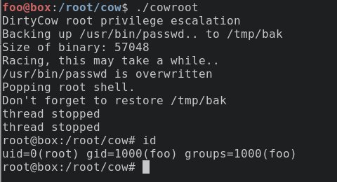 After some trial and error I got stable version on some systems, however on a few others the kernel crashes after some seconds. I was not able to fix this, maybe someone else can achieve it with a different technique. There is a list of a few more PoC’s available on the official DirtyCow repository (yeah, mine is also there).