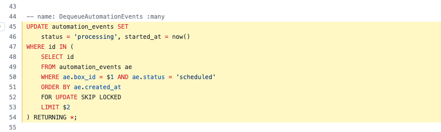 This is also what hntr makes use of. It’s not exactly the same as in the article, because I’m working with a job status (scheduled, finished, …) here instead of deleting the row. This is just a minor improvement to keep job data for inspection (and for their result counts).