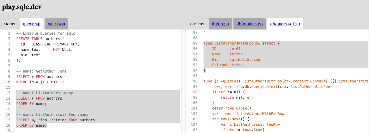 Based on a schema and queries, sqlc will generate types and functions which allow to interact type-safe via SQL. In case of PostgreSQL, sqlc is able to understand native PostgreSQL types and represent them appropriately in Go. It combines the best of two world: Powerful, handmade SQL queries with auto-generated types and functions to use them.